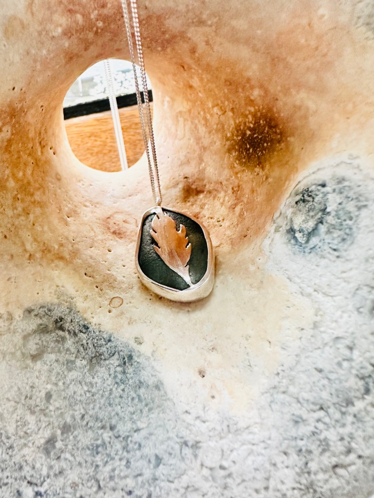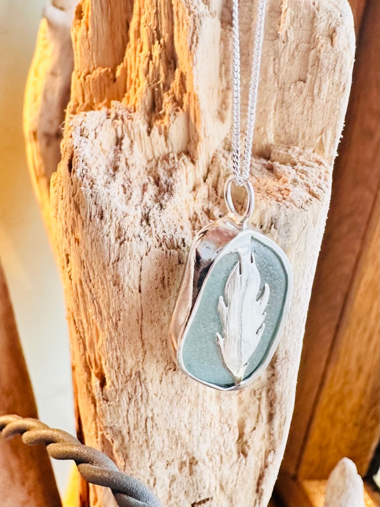These are rather special as on one side they appear to be a beautiful silver-mounted piece of sea glass, but hidden on the reverse is a heart cut-out. You can choose to wear it either way around depending on whether you’d like to keep the heart secret with your own special meaning or show the world! Or maybe it depends what mood you’re in or the occasion for which you are wearing it. If you choose to wear it with the plain (thought it’s anything BUT plain) natural sea glass outermost, you can reveal the hidden heart by holding it to the light as shown in the images below.