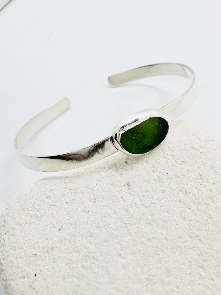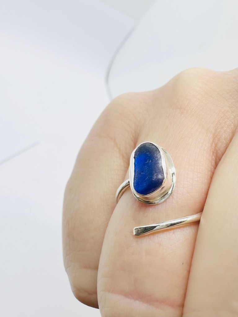 These recycled sterling silver rings have an open finish which allows for flexibility over a few sizes. This allows for the wearer to swap the ring onto various fingers or to allow for swelling or larger knuckles. Prices start at £42 depending on shape, size and amount of silver used in the design. I am very happy to use your own seaglass if you have collected something special or meaningful. Contact me to discuss.
